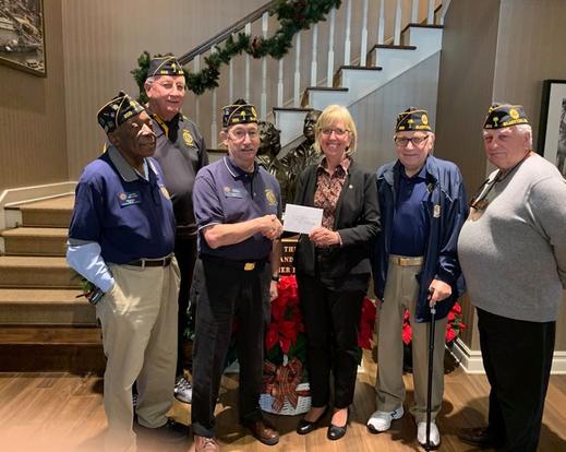 On April 26, 2017 Commander Courtney Peeples, Second Vice Commander David Leite, Adjutant Mike Miranda, and Past Commander Bob Sterling visited the Fisher House construction site and presented a check for $750 to Kent Hutchinson, Co-chairman and Treasurer of the Fisher House Foundation. The $750 is one-fourth of the profit from the 2016 golf tournament as voted on by the membership. Below is the 2019 presentation with Commander Dave Robins (third from left) presenting the check. Golf Tournament co-chairman Dan Desmond (far right) was also present.