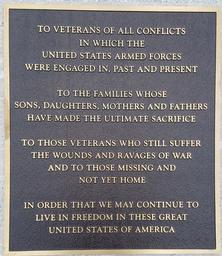 The memorial will be dedicated to the men and women of the Armed Forces who have served our country and community with valor and self-sacrifice. It is intended to be a peaceful respite for the community and visitors, and serve as a place to pay tribute and give thanks to those who made the ultimate sacrifice and to those who served.